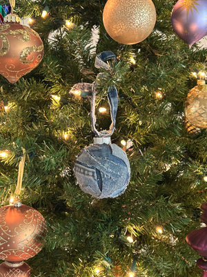 Handcrafted from production waste from our sewing studio, these distinctive ornaments transform denim scraps into festive keepsakes. Each piece combines salvaged selvedge edges, belt loops, hems, and fabric remnants collected throughout our bag-making process, ensuring no material goes unused. The result is a genuinely unique ornament—no two are identical due to the varied composition of reclaimed denim. Measuring slightly more than 3 inches in diameter, this 100% upcycled creation reflects our commitment to circular manufacturing and sustainable design practices.